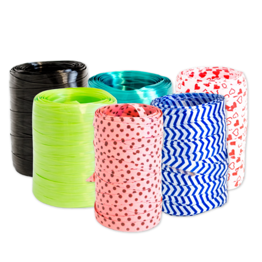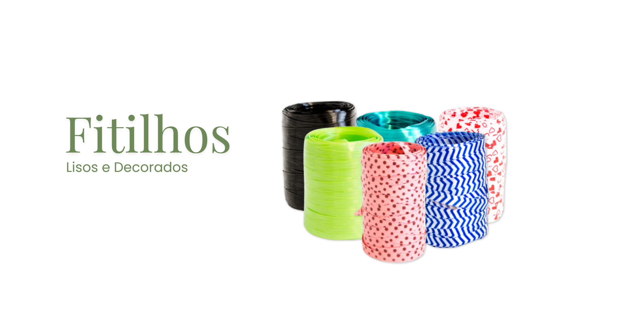 Fitilhos lisos, metalizados, coloridos, decorados ou estampados, disponíveis em metragens mais longas (30m, 50m e 200m).